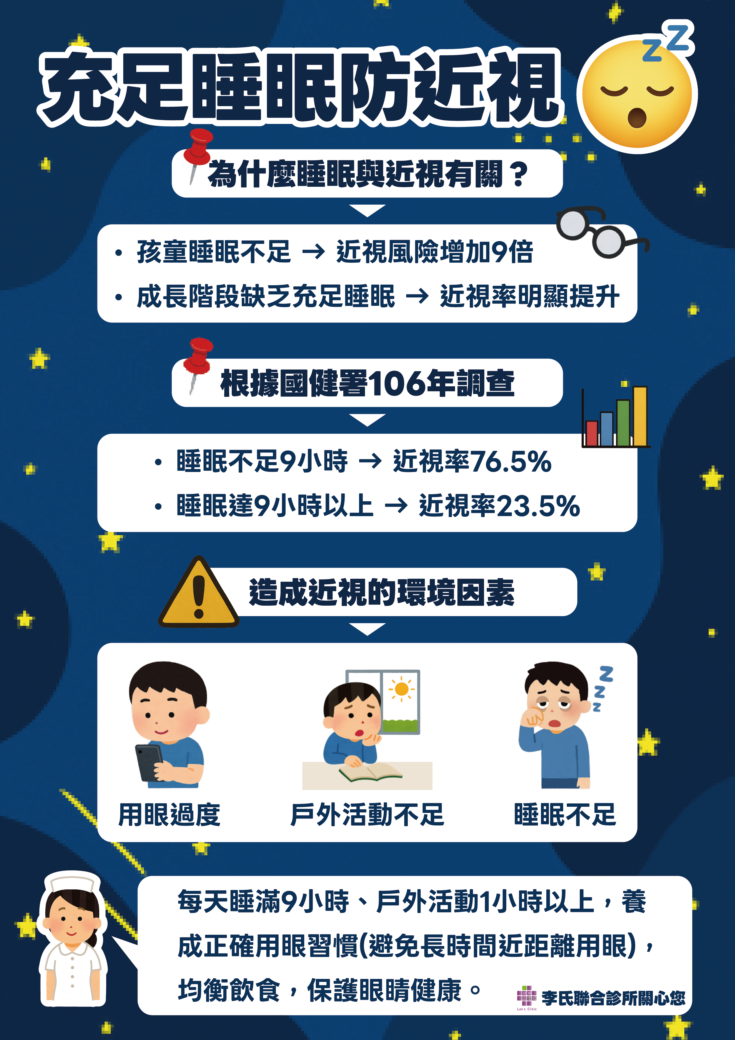 學童視力不良問題,主要以近視👓最嚴重,歸因於長時間、距離近、用眼不當所致。